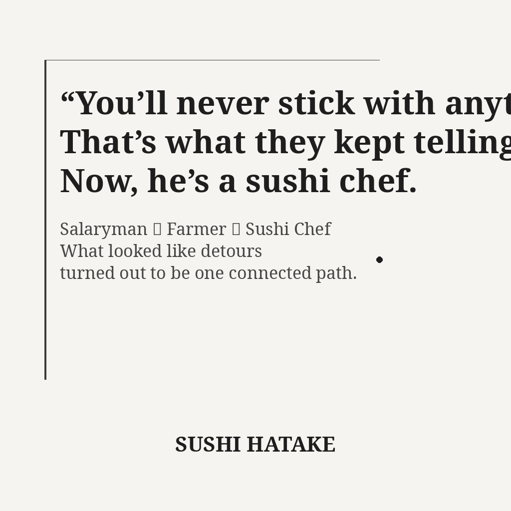 確かに私の人生を振り返ると、サラリーマン → 農家 → 寿司職人と、「一つのことを極める」という生き方からは外れているかもしれません。