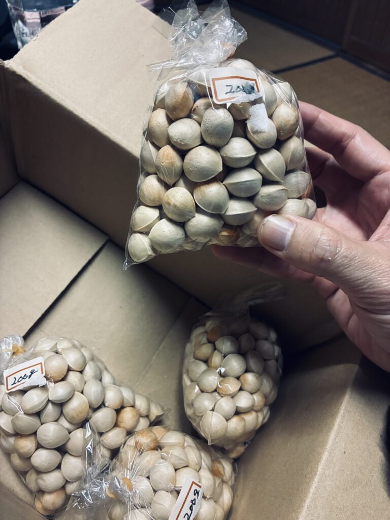 The bags had handwritten labels like “200g” on them—she was in full business mode. And when I asked more, she told me she’s not just selling ginkgo nuts, but also persimmons and kiwis that she gets from friends and neighbors.