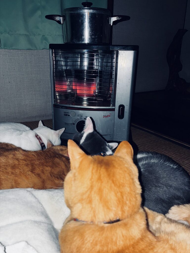 I brought our cats from Tokyo, but once they discovered the warmth of the heater at my mother’s house, they refused to move. Orange tabbies, a white cat, a tuxedo cat… all lined up facing the heater like they’re worshipping something.